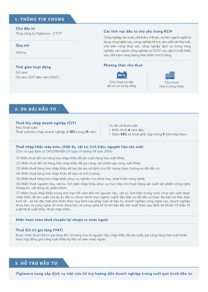 • Là khu công nghiệp do Tập đoàn Viglacera – một trong những nhà phát triển khu công nghiệp chất lượng cao tại Việt Nam – đầu tư và phát triển.
